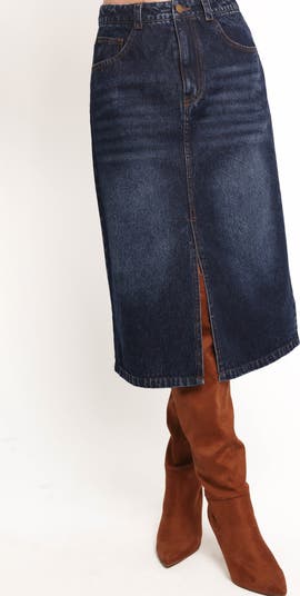 Subtle fading and whiskering enhance the everyday versatility of this essential nonstretch-denim midi skirt.