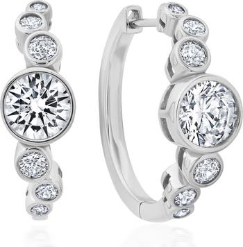 A staggered stream of hand-set cubic zirconia bezels beams light from the front of these stunning hoop earrings.