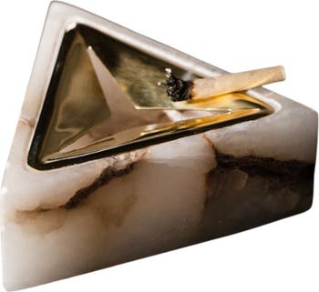 The unexpected triangular shape of our Starfall cigarette trays sets them apart as sculptural accents for the tabletop. Each handcrafted alabaster tray features a polished brass insert to collect ashes and protect the stone. Available in two sizes, they offer versatility for bedside or coffee table use. These sleek creations can also double as luxurious holders for jewelry or other small treasures.