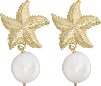 Textured sea stars and lustrous pearls bring dreamy oceanic style to elegant drop earrings in 14-karat gold plate.