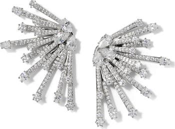 Dazzling starbursts illuminated by pear-cut and round cubic zirconia sparkle on these glamorous front/back earrings plated in hand-polished rhodium.