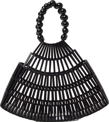 Glossy ball-bead handles and a sculpturally caged body blur the lines between art and fashion with this see-through handbag crafted from inky wood.