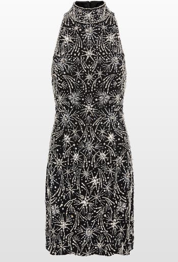 Evoking the brilliance of a clear night sky, this high-neck mini dress dazzles with starburst embellishment that radiates across its fitted silhouette. The halter neckline and open shoulders lend a modern elegance, while the intricate beading ensures a captivating presence from every angle. A statement piece designed to light up the evening.