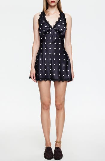 Scalloped lace trim charmingly frames this slinky satin minidress designed with a halter neckline and playful allover polka dots.