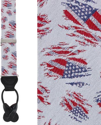A distinguished celebration of heritage and craftsmanship, the Stars & Stripes Secret Silver Silk Novelty Button End Braces blend patriotic character with refined sartorial elegance. Woven in lustrous silver-toned silk, the design subtly reveals painterly interpretations of the Stars and Stripes in rich crimson and navy, a bold motif softened by the sheen of fine silk for a look that is both confident and cultivated. Balanced with traditional button ends and a classic Y-back construction, these braces offer impeccable structure beneath tailoring while delivering a discreet flash of personality when revealed. A statement accessory for the gentleman who values tradition yet appreciates distinctive detail, refined, expressive, and impeccably tailored. Features a 35mm width and adjustable length (33 - 48 inches) to ensure a tailored fit and all-day comfort.