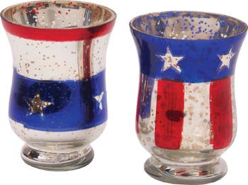- Featuring a stars and stripes motif in red, white, and blue tones, each glass holder showcases a patriotic pattern with metallic accents. The reflective interior enhances candlelight, creating a soft and inviting illuminated effect.