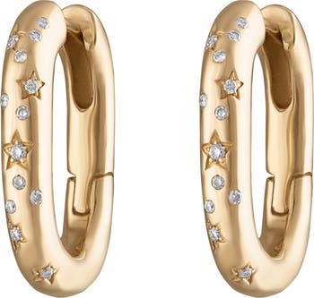 Diamonds dance along the curves of these star-etched huggie earrings rendered in 14-karat gold so they warmly glow from your lobes.
