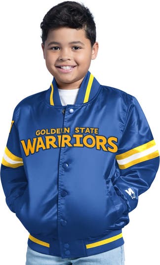 Let your young fan rep the Golden State Warriors with this Scrimmage Full-Snap Varsity Jacket from Starter. This jacket features classic striping details on the sleeves and includes ribbed cuffs, hem, and collar for a snug yet comfortable fit. The Golden State Warriors word mark on the front chest and team logo proudly displayed on the back lets everyone know who your kiddo is rooting for.