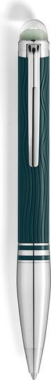 Inspired by the beauty of the Northern Lights, this ballpoint pen features a sleek design with a precious resin barrel and platinum-coated fittings. The dome on the cap top is made of transparent resin and glows in low light, recalling the enchanting, dancing auroras of the night sky. The wave pattern on the dark-green precious resin of the cap and barrel admirably captures the spectral sheen of the lights, and the matte finish accentuates the seemly reflections.