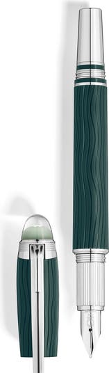 Inspired by the beauty of the Northern Lights, this fountain pen features a sleek design with a 14k-gold nib and an elegant rhodium coating. The dome on the cap top is made of transparent resin and glows in low light, recalling the enchanting, dancing auroras of the night sky. The cap and fittings are coated with platinum. The wave pattern on the dark-green precious resin of the barrel admirably captures the spectral sheen of the lights, and the matte finish accentuates the seemly reflections.