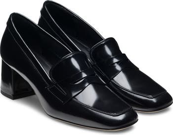 A classic penny keeper and squared-off moc toe further the loafer-inspired profile of a Spanish-made pump set on a cushioned footbed and wrapped block heel.