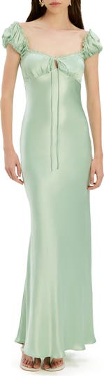 Ethereal and effortless, this satin slipdress drapes on the bias for a fluid silhouette. Delicate lace traces the neckline, while gathered bust detailing, ties at the neckline and soft cap sleeves add romantic charm.