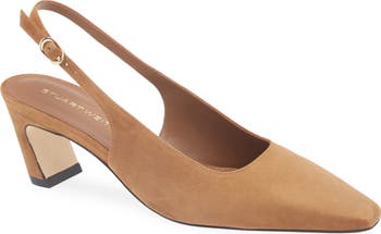 An elongated square toe and slanted block heel add an air of well-honed elegance to this slingback pump shaped from supple Spanish leather.