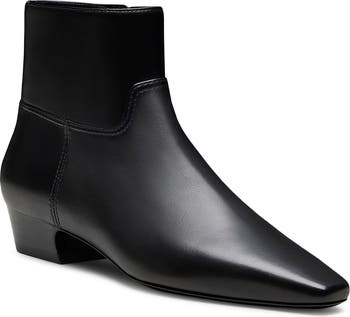 Polished leather elevates this sleek ankle bootie styled with a sharp pointy toe and grounded on a subtly flared heel.