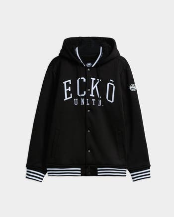 This varsity jacket features a fixed hood with adjustable drawstrings for tailored coverage. Side welt pockets and ribbed finishes provide functional structure. Fully lined faux shearling delivers warmth while keeping the profile classic and practical.