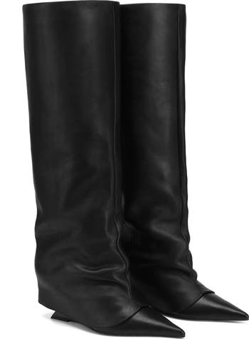 Elevate your style with Stated Black Leather boots. These luxurious boots feature a pointed 70mm heel height with a sprayed finish and a unique wolfe head design. The trouser leg detail adds a touch of sophistication to these exclusive boots. Made with premium black leather, they are the perfect statement piece for any outfit.