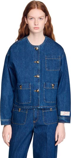 Straight-cut raw denim jacket with a round neck, long sleeves and a decorative button fastening.