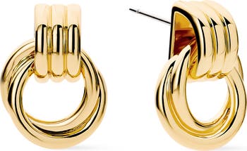 These statement earrings are here to add something eye-catching to your next ear stack. Plated in 14k gold, these earrings feature a chunky design with multiple rings for a unique finishing touch. Style these earrings with a pair of sparkly studs, like our Suzanne huggies, for a bold and sparkly look.