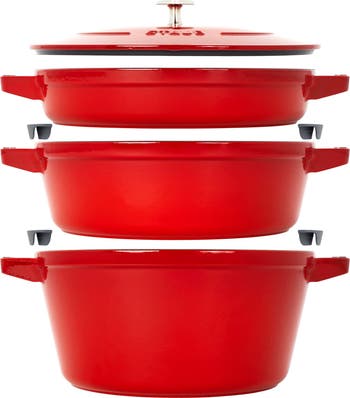 Additional features: Cook soup on the weekend in the cocotte, braise chicken thighs midweek in the braiser and grill burgers on the grill pan for a quick family meal. Attachable rubberized bumpers are included to ensure each piece remains scratch-free when stacked and unstacked. The textured black matte enamel interior requires no seasoning and ensures exceptional browning and heat retention and distribution. The smooth enamel bottom works on all stovetops, including induction. A heavyweight, tight-fitting lid retains moisture, while spikes on the lid create a rainforest effect, evenly returning juices back onto food.