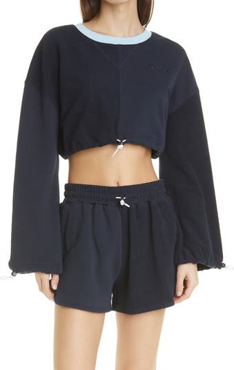 Short and sporty, this sweatshirt is cinched with a bungee cord at the cropped waist and long sleeves to adjust the fit from loose to bloused.