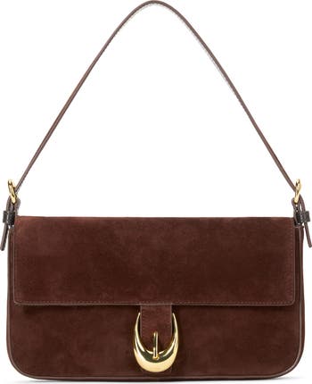 Gleaming logo hardware and a supple suede exterior distinguish a structured shoulder bag fitted with an adjustable strap for versatile styling.