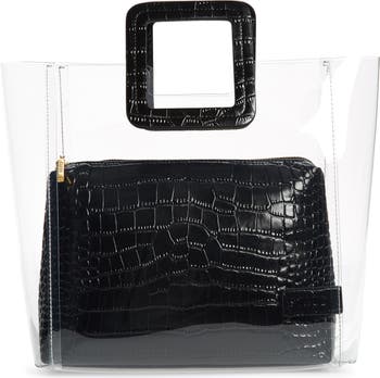A structured tote gets a street-chic update with an of-the-moment transparent shell paired with a removable zip pouch in croc-embossed leather.