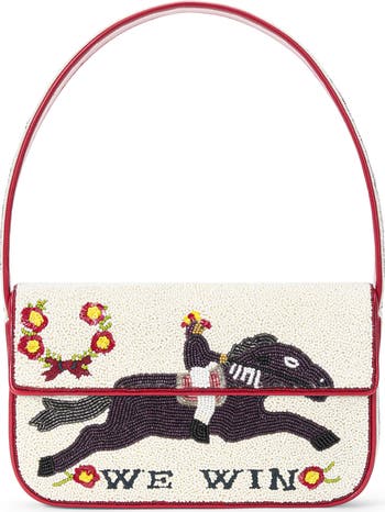 Beaded with a playful motif and edged with faux-leather piping, this shoulder bag brings a cheery, retro vibe to your look.