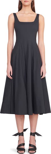 Corset-inspired princess seams create a fitted shape for a full-skirted midi dress made from lightweight stretch poplin.
