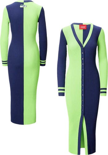 This Shoko dress from STAUD is a versatile display of Seattle Seahawks spirit. With a button-up front, this stretchy layer is made of cozy compact rib knit, supplying a super-soft feel and offering a flattering silhouette that curves and falls to your figure. It also has the added benefit of being worn as a dress or sweater cardigan, giving you multiple ways to flaunt.
