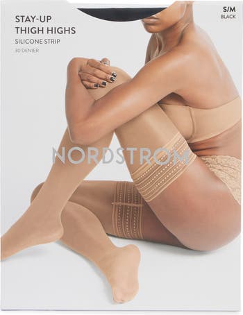 A patterned lace brings sensual elegance to sheer, thigh-high stockings topped with silicone grippers for a no-slip fit.