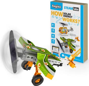 ENGINO - STEAM LABS JUNIOR: HOW SOLAR ENERGY WORKS - 4 DIFFERENT MODELS. STEAM Labs How Solar Energy Works is an educational kit that teaches kids about solar energy and how it works. With hands-on activities and experiments, this kit provides a fun and engaging way for kids to learn about renewable energy and its applications in our daily lives. MULTI-LEVEL LEARNING SYTEM: Level 1: Building. Level 2: Drawing. Level 3: Experimenting. Level 4: Learning. It’s not just learning—it's inventing, exploring, and imagining through art-infused STEM. PATENTED CONNECTING SYSTEM: Creative snap fit. Easy assembly and construction. EXTRACTION TOOL: For easy disassembly. Option 1: Squeeze the tool to disassemble small parts. Option 2: Push into the hole to pop-out the locked part. 3D MODELS APP: With the Engino kidCAD 3D viewer app you can experience the models in a whole new way. Rotate, zoom in and out. Explode and implode. Find and explore more models. 3D interactive instructions. Printed instructions included. STEAM LABS TOYBOOK SERIES has been developed based on the latest pedagogical trend that incorporates “Arts” within the STEM wording. Even though art is an inherent part of the engineering design process, “A” puts emphasis on one of the highest brain functions of human beings, that of inspirational creativity. “Inspiration” has been the driving force behind all humanity’s masterworks, either inventions, architecture, music, painting or literature. STEAM LABS toybook series innovate further by bundling the toy with the Theory & Activity book on the outside of the box, shrink-wrapped together. Each set includes sheets of paper with pre-defined sketches which kids can paint, cut and attach on their models. The books explain the theory about the subject and include smart experimental activities that relate to each theme. These books come with our free Augmented Reality app (AR) that makes content much more engaging and entertaining!
