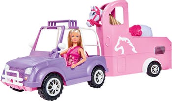 Steffi Love is ready to hit the road in style with her color-coordinated Jeep and horse trailer! This playset includes a beautifully detailed horse with a pink saddle, perfect for imaginative adventures in nature. While Steffi’s 11" doll (not included) drives the Jeep, her faithful friend rides comfortably in the roomy trailer. A must-have for any little animal lover or aspiring rider, this set offers endless pretend play fun. Recommended for ages 3 and up.
