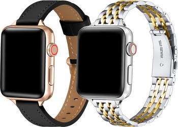 Upgrade your smartwatch with a classic band bundle that takes you from day to night and everywhere in between. Made with quality materials and sleek designs that fit perfectly into everyday life. Both bands include universal connectors that fit all models of Apple Watch® and most Smartwatch models. Included in this set: Stella Skinny Stainless Steel Band - With its slim profile and dual-toned matte/polished finish, it offers understated elegance and a secure double-button clasp. 7.09" L x 0.55" W Carmen Skinny Leather Band - Ultra-thin and luxuriously soft, this genuine leather strap enhances your smartwatch with all-day comfort. 7.87" L x 0.55" W