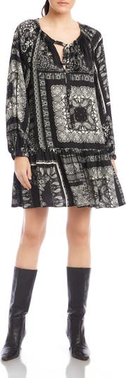 A bandana-inspired paisley pattern makes a showy statement on a drop-waist dress cut to a leg-baring length.