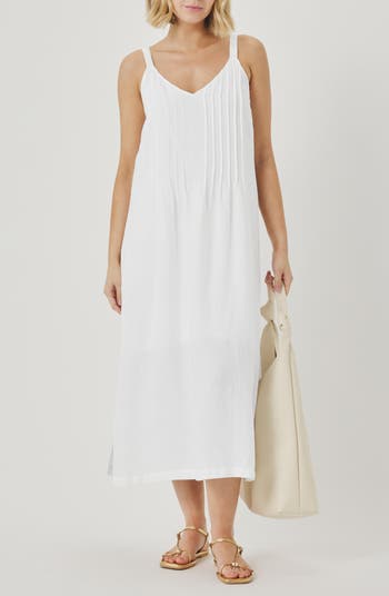 Keep it cool and cute in an easy, breezy dress cut from cool linen and offered with pretty pintucks and a sweet side slit.