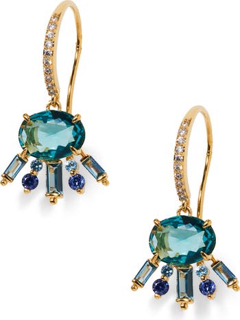 A mix of beautiful blue and turquoise-hued crystals bring elegant sparkle and color to scene-stealing drop earrings plated in high-shine 18-karat gold.