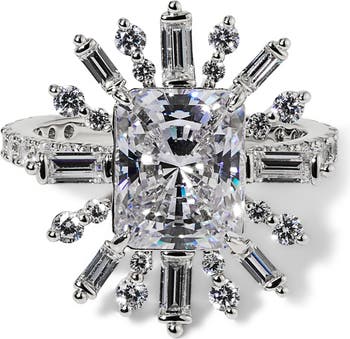 Absolutely dazzle with this vibrant ring showcasing an emerald-cut center stone haloed by mixed-cut crystals that seem to burst with sparkle and light.