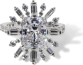 Absolutely dazzle with this glamorous ring showcasing an emerald-cut center stone haloed by mixed-cut crystals that seem to burst with sparkle and light.