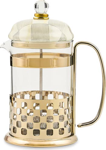 Wake up and smell the coffee made in this hand-painted check French press that sits in a bronze-finish base. The plunger-style brewing method results in 32 ounces of fresh coffee, which is revered for its rich, full-bodied character.