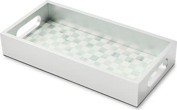 Hand-painted, color-dragged checks bring a signature touch to this glass tray, which is a perfect organizer-catchall for the powder room, vanity and office desk alike.