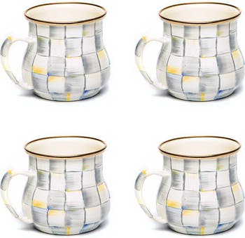 Your morning caffeine is even more invigorating when served up with the hand-painted color-dragged checks of these enameled-steel mugs that are amply sized for however your day is starting.