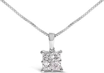 Discover the quintessence of elegance with this .925 sterling silver pendant necklace, rhodium-plated to promise an everlasting allure melded with unmatched durability. Each of the four natural princess-cut diamonds is masterfully set in an invisible setting, conjuring the grand illusion of a singular, voluminous diamond. The resplendent stones, boasting H-I color and I1-I2 clarity, dance with a fire that captures the very essence of sophistication. Suspended from an 18-inch box chain secured by a spring ring clasp, this necklace promises a classic refinement that whispers tales of timeless grace and beauty. Perfect for adding a touch of luxury to every ensemble, it is an emblematic gift or a treasured keepsake, ensuring its place in the annals of cherished heirlooms.