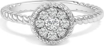 Discover elegance woven with sparkle in this exquisite ring, plated in rhodium to shimmer with every gesture. Crafted from .925 sterling silver, its band presents a unique braided texture that gracefully entwines around the finger, offering a sense of sophistication and intricate craftsmanship. At the heart lies a captivating floral motif, blossoming with natural diamonds that boast an I-J color and I3 clarity, meticulously set in a micro-pave arrangement to enhance their radiant luster. This piece isn't just jewelry; it's a testament to timeless design and the beauty of nature's treasures combined to accessorize your life's most memorable moments.