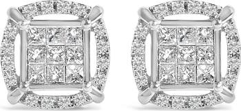 Sterling Silver 1 Cttw Princess Cut Diamond Square Halo Stud Earrings