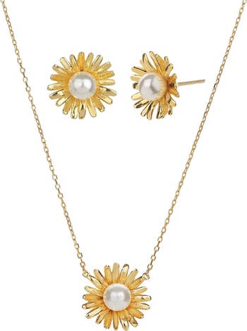 Sterling Silver 18k Gold Plated Flora Pearl Necklace & Earring Set Dainty