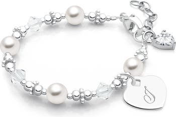 Pearls for beauty, Swarovski for sparkle, and cubic zirconia for shine. This keepsake becomes extra special with her initial and will be treasured always.