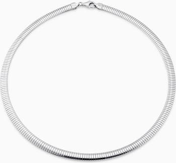 This 17-inch omega necklace is crafted in sterling silver and designed in a bold 6mm thickness, giving it that smooth, mirror-like shine that lays flat and flawless against the skin. Its sleek, structured profile brings instant polish to any outfit—simple, sophisticated, and timeless. Wear it solo for a clean statement or layer it for a luxe, modern stack.