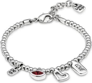 Sterling silver-plated bracelet with multiple pearly pieces, from which hang three charms: a padlock and a heart, representing the sealed love, and an oval circle in the center with a red SWAROVSKI® ELEMENTS crystal stone.