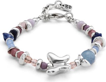 Silver-plated bracelet with a design of multicolored blue and pink handcrafted crystals, and a central butterfly.