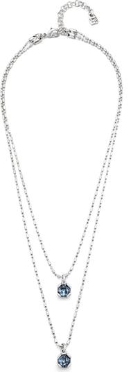 Sterling silver-plated necklace that combines two chains at different heights with two central blue faceted crystals and adjustable carabiner clasp.